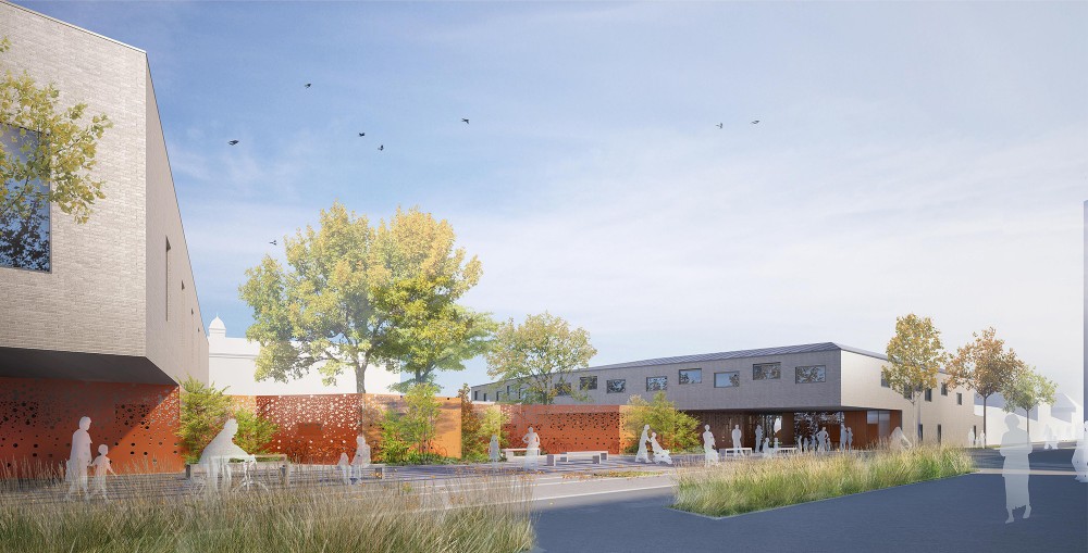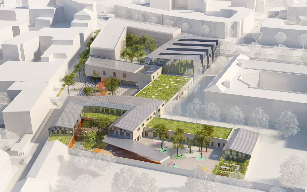 L’îlot du projet est symptomatique de l’imbrication entre l’ancien et le moderne créée par les transformations récentes de la rive/sud avec ses immeubles récents entourés d’anciennes usines, ses maisons de brique et moellons, et ses pavillons, et se situe au croisement de différents paysages, différentes époques, différents styles de constructions. Ce tissu urbain en mutation oriente le projet vers une imbrication des trois équipements. L’opération est conçue comme un seul et même projet, développant ses espaces au gré des liaisons entre les activités.