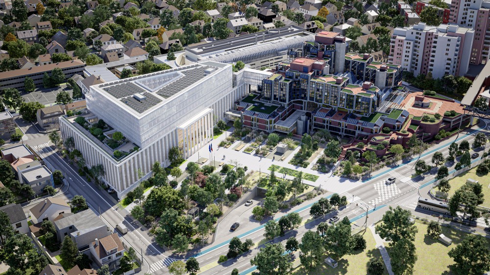 Le Tribunal de Bobigny fête ses 50 ans avec un ambitieux projet d’extension destiné à être mis en service en 2028. Le projet d’extension s’inscrit dans la dynamique d’évolution et de requalification de ce quartier de Bobigny, que viendra parachever l’arrivée d’une future station du Grand Paris Express. Le futur tribunal s’affirme comme un nouveau point focal urbain. L’aménagement de son parvis prolonge la perspective de la rue Pablo-Picasso, avec le fronton monumental du tribunal en arrière-plan.