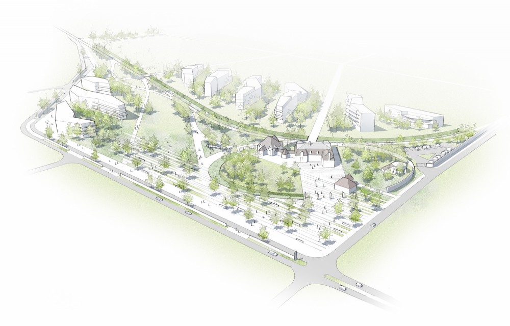 - L’esplanade est un espace ouvert de mise en scène du château. Largement ouverte et orientée vers l’avenue Vanderbilt et la rue des Frères Tissier, elle suggère une connexion franche et évidente avec le projet de «Carrières Centralité»,