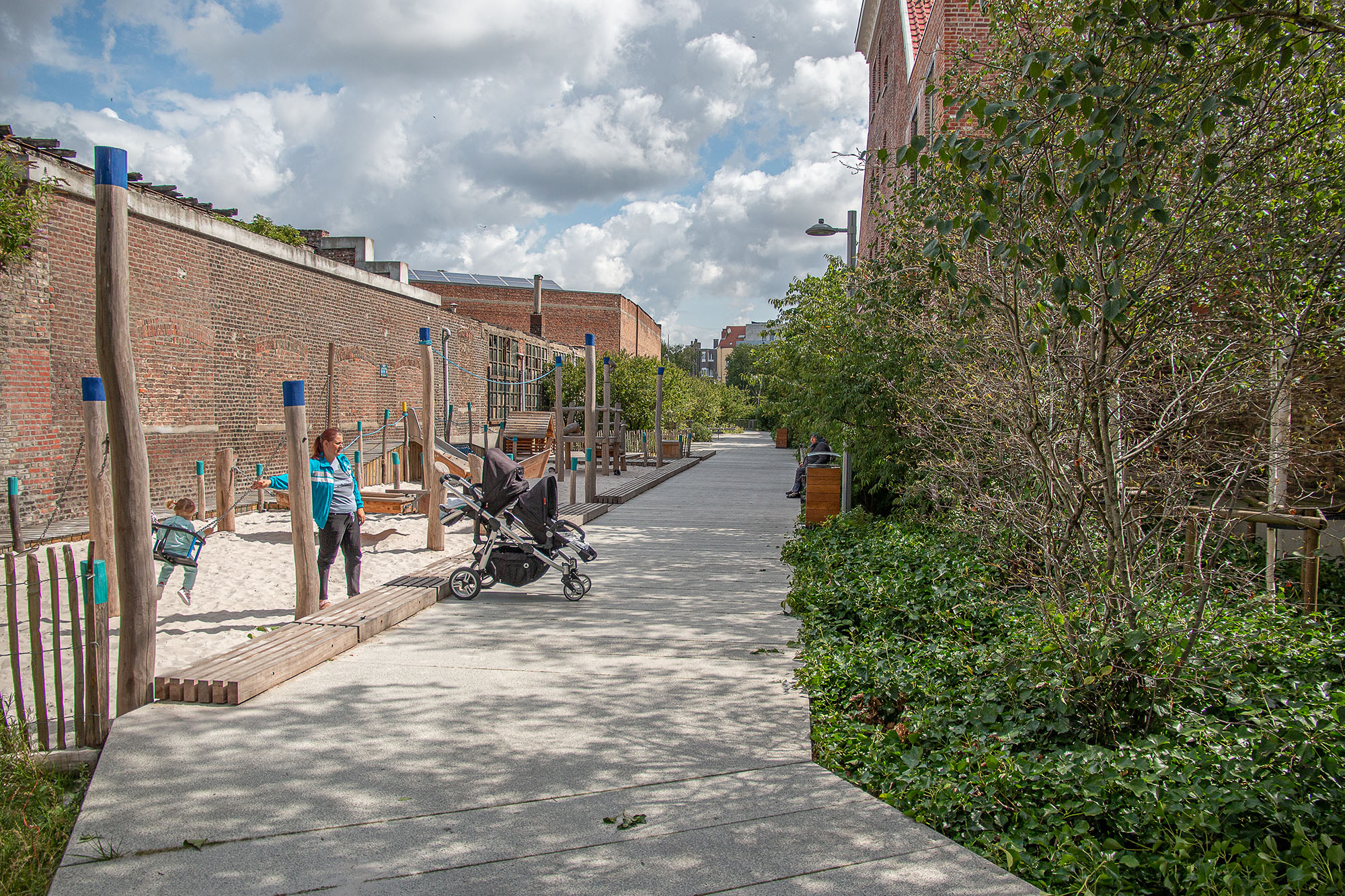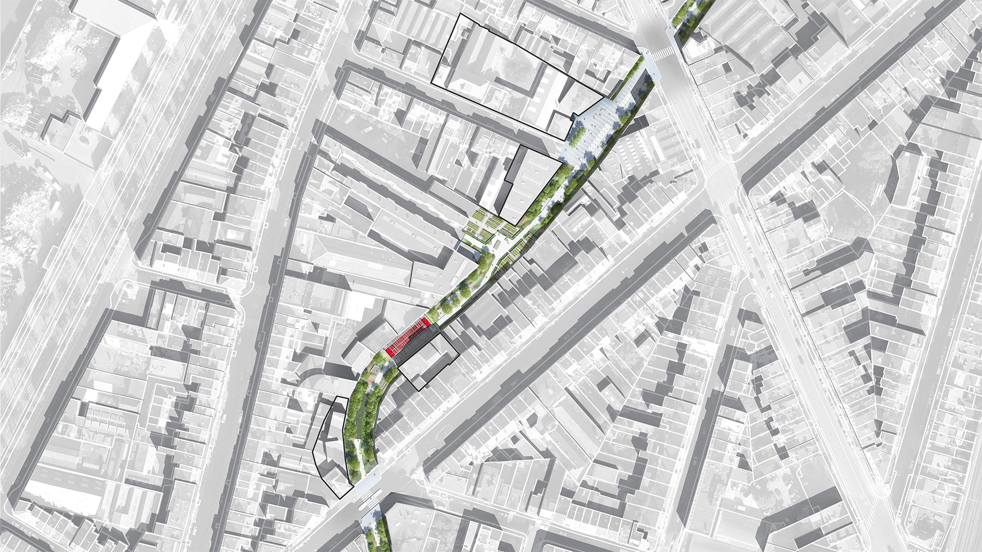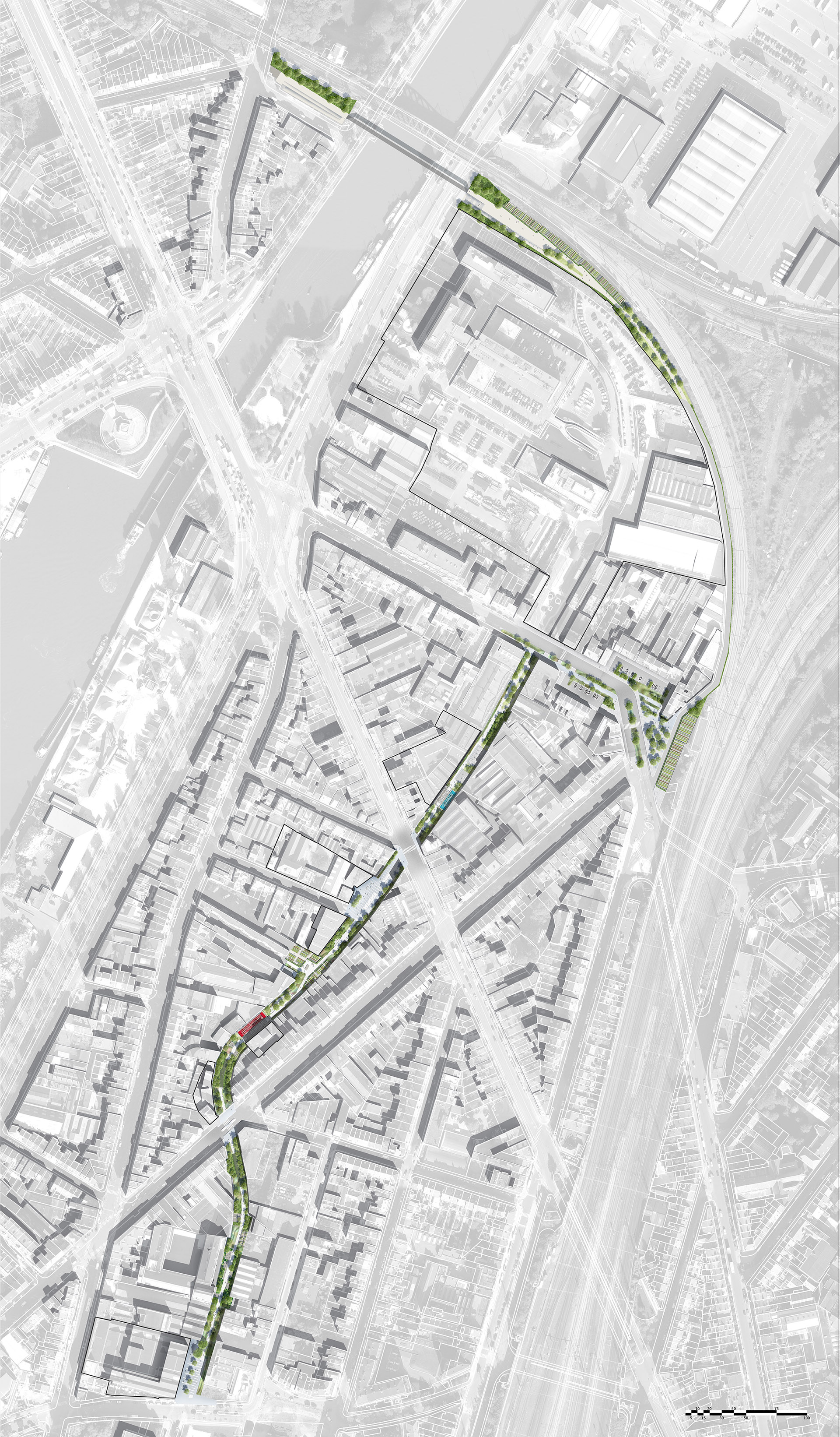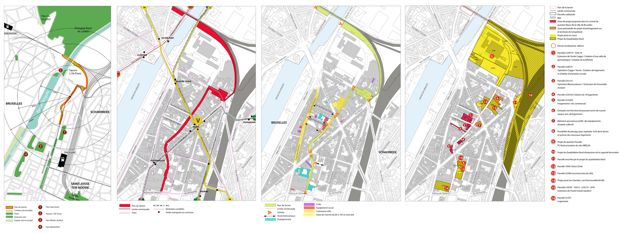 Ce linéaire de parc situé en plein cœur du quartier Masui est aujourd’hui l’unique espace libre dont disposent les communes de Bruxelles et de Schaerbeek pour développer un espace public de référence dans ce quartier. Cet espace « précieux »  est destiné à devenir un espace de rencontre et de convivialité. Ce projet, situé sur le lit de la rivière couverte de la Senne possède un double enjeu. Il renforcera, par sa trame végétale actuelle l’identité du quartier mais aussi le maillage vert régional de Bruxelles-Capitale reliant ainsi le quartier Laeken et le parc du 21 juillet.