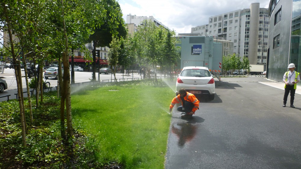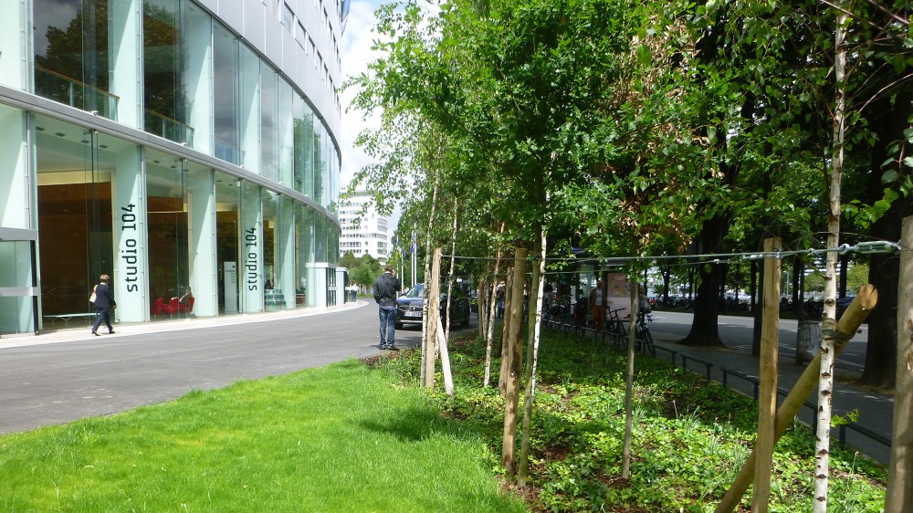 Le chantier des espaces extérieurs de la Maison de la radio débuté en juillet 2014 avance à un bon rythme. 4 tranches de travaux sont prévues. La 1ère tranche est terminée et la 2ème est en cours. Nous avons donc un aperçu de ce que sera l’écrin de cet équipement majeur parisien.